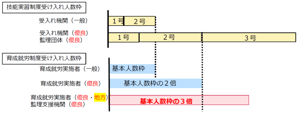 また転籍においてのみだけでなく、地方の育成就労実施者(企業)においては、育成就労実施者(企業)と監理支援機関が共に優良であることを条件に、基本人数枠の3倍まで受け入れ人数枠を増加になるルールが設けられる見通し。