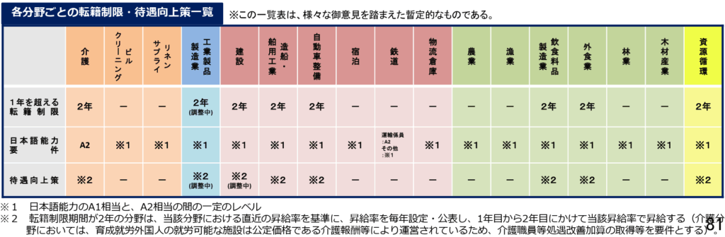 2025年9月時点における、各分野での転籍制限の期間と、待遇の向上義務は以下の通り。
